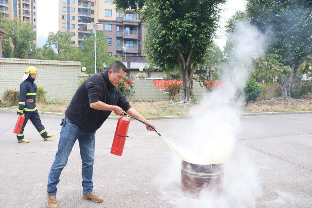在灭火器使用环节,工作人员详细演示“提、拔、握、压”标准操作流程,指导参与者亲身实践,熟练掌握初期火灾扑救技巧。