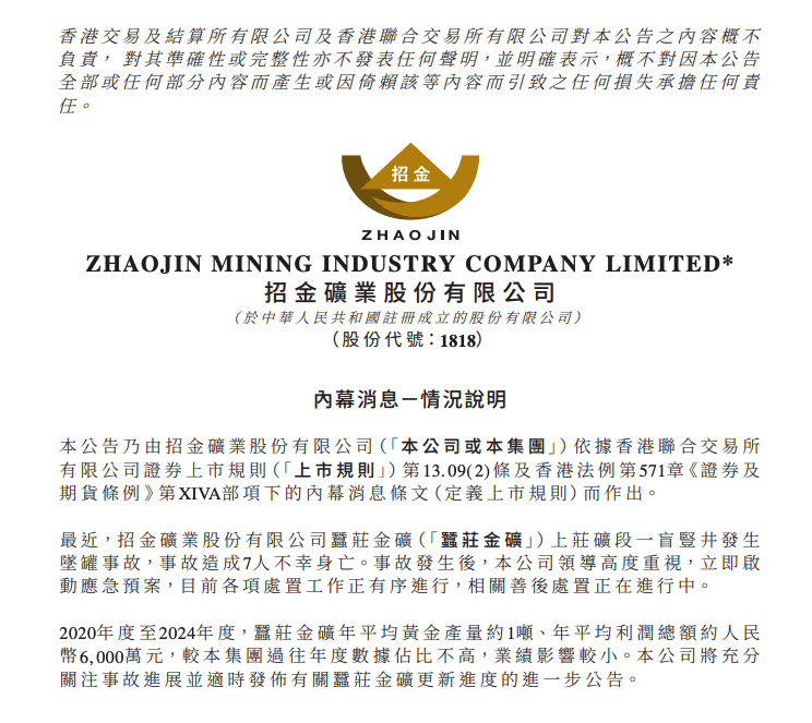 2月10日晚间,招金矿业在港交所发布公告称,最近,公司蚕庄金矿上庄矿段一盲竖井发生坠罐事故,事故造成7人不幸身亡。事故发生后,公司领导高度重视,立即启动应急预案,目前各项处置工作正有序进行,相关善后处置正在进行中。