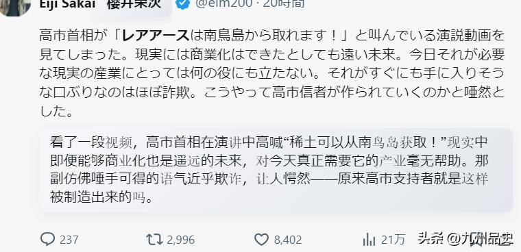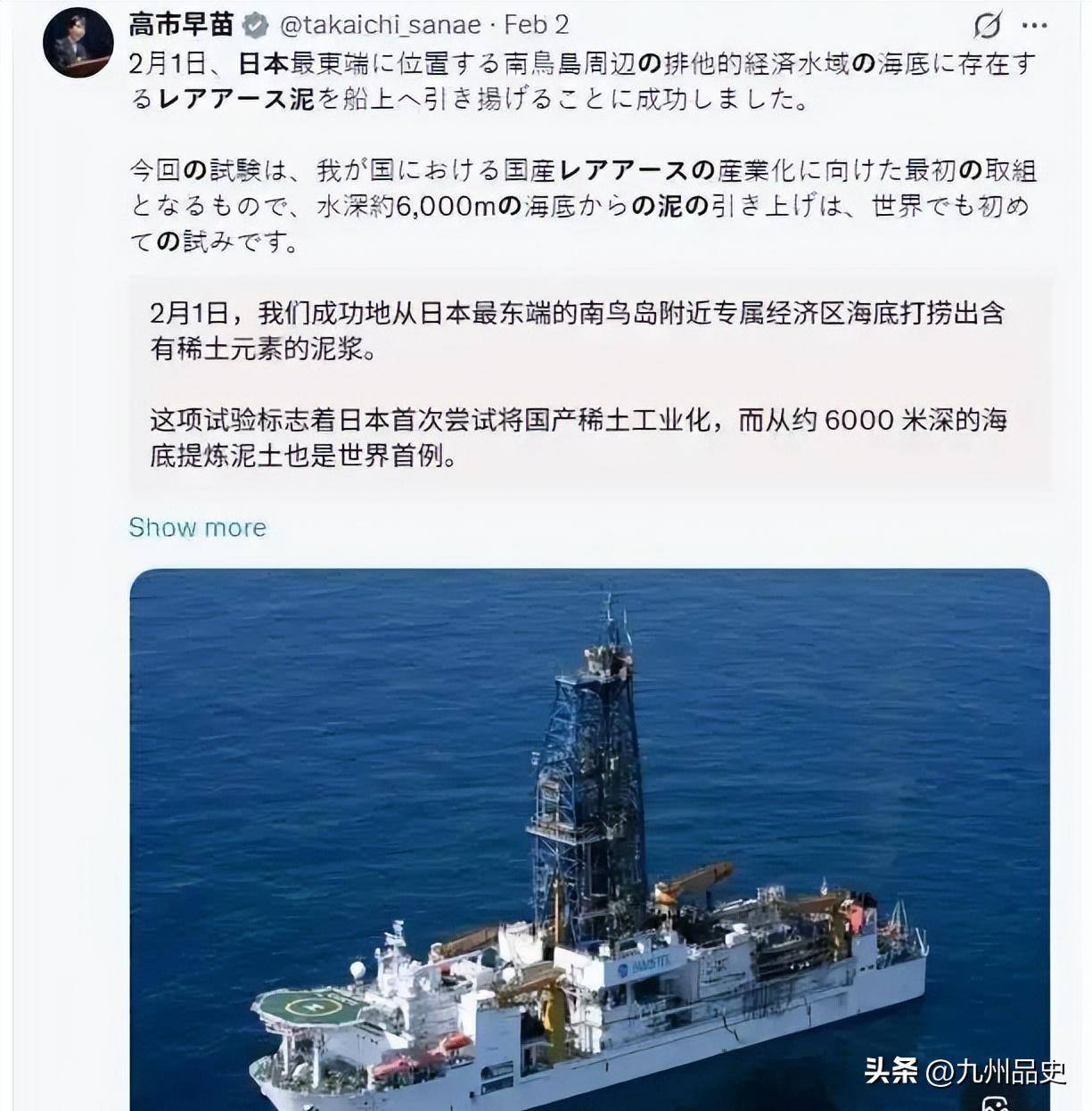 日本在外交上因为高市早苗的激进路线陷入被动,稀土供应面临前所未有的压力,产业界人心惶惶。这个时候,把一个2012年就发现的海底稀土矿翻出来重新炒一遍,配合全球首次深海试采的噱头,通过媒体大规模渲染,营造出日本即将稀土自主的假象,目的无非是安抚国内情绪、给选举造势、对外表演底气。