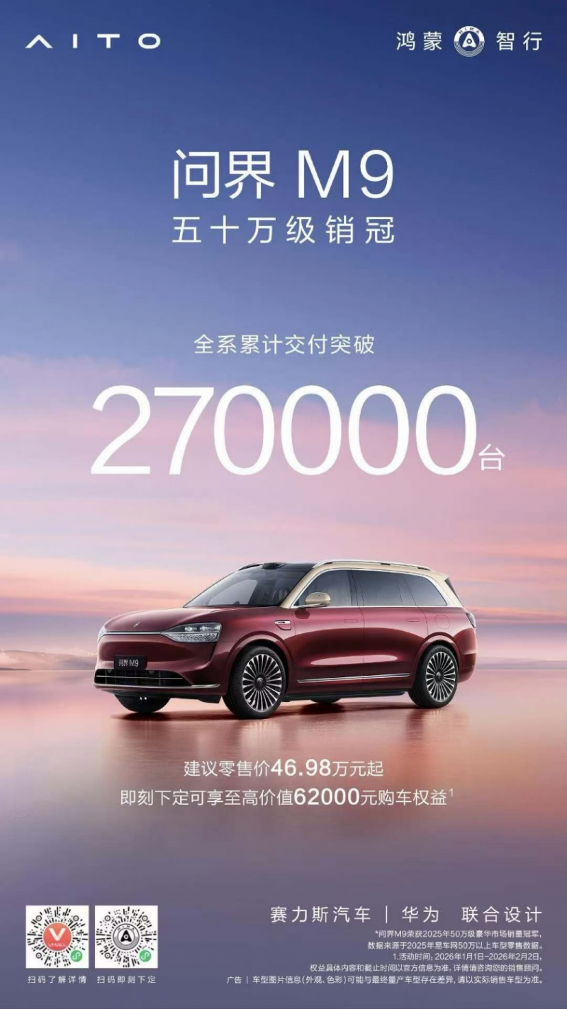 其2025年12月上险量达到9222辆,超越宝马X5、极氪9X等竞品;累计24个月交付突破27万台,连续21个月稳居50万级销冠。剖析背后原因,新能源市场“科技豪华”的转型趋势与产品力、用户口碑(连续9个月保值率冠军、三次NPS榜首)形成的正向循环,共同驱动了销量的稳健增长。从数据层面审视,问界M9的销量表现超越了单一车型范畴,反映了50万级市场“产品力驱动”的逻辑转变,这对理解高端新能源汽车市场动向具有参考意义。